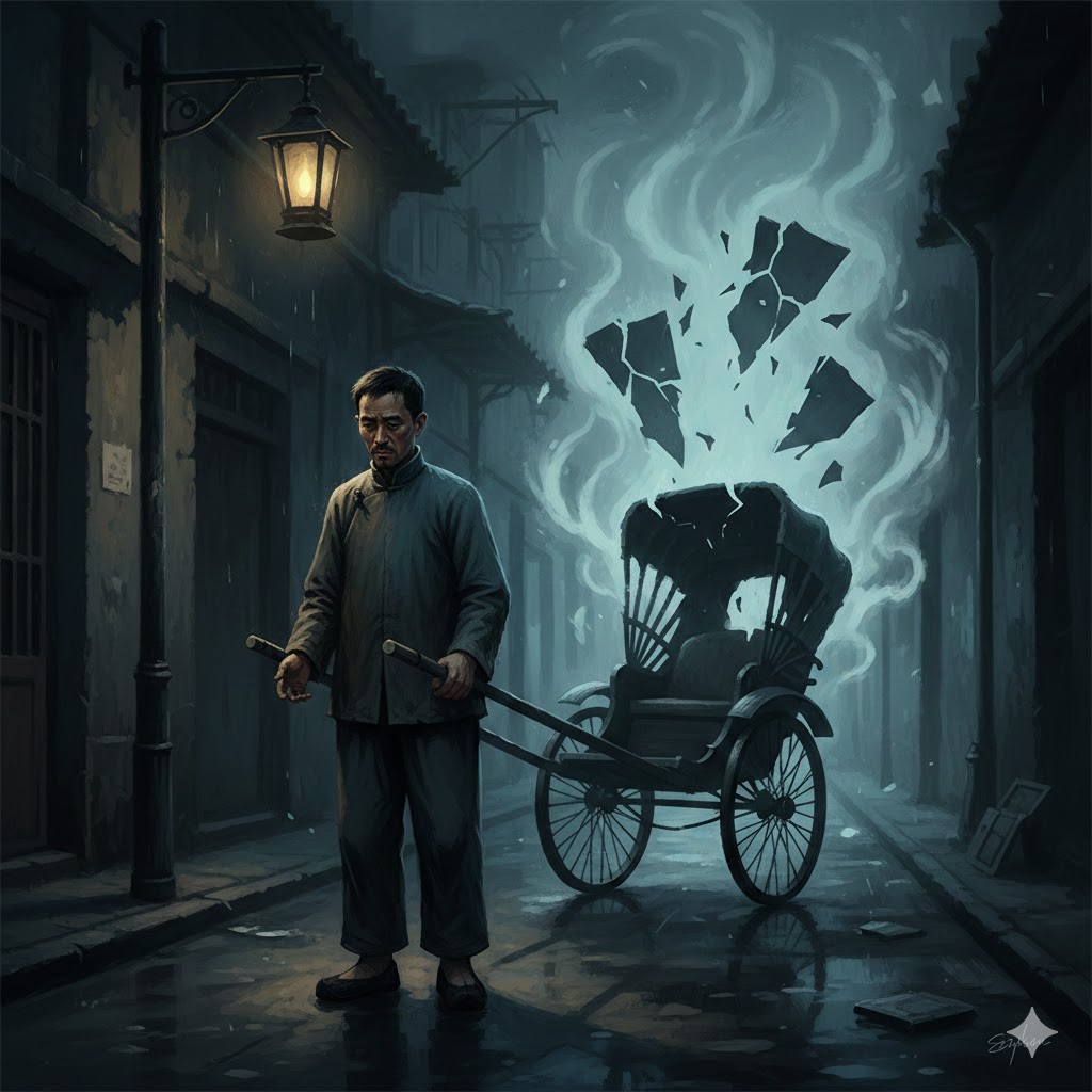 부서지는 인력거와 연기: 샹쯔에게 인력거는 단순한 도구가 아니라, 삶의 희망이자 자부심이었어요.