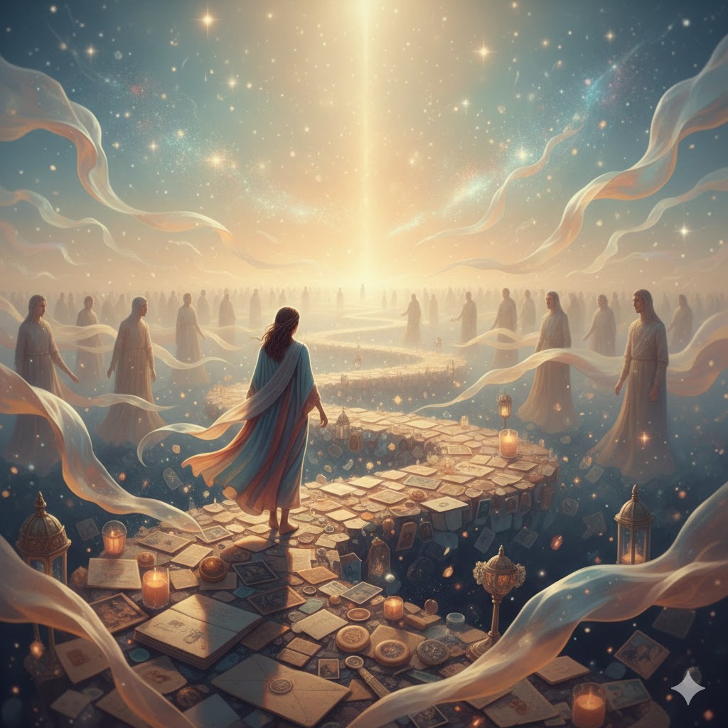 시각적 구성: 과거의 사진, 편지, 추억의 물건들이 겹겹이 쌓여 만들어진, 긴 길 위를 한 인물이 평온하게 걸어가고 있어요.