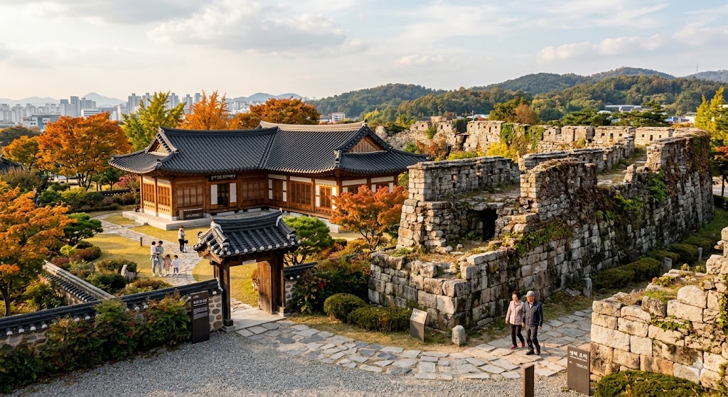 전형적인 한국의 성곽 구조와 전통 가옥이 공존하는 문화유산의 현장을 보여주는 이미지예요.