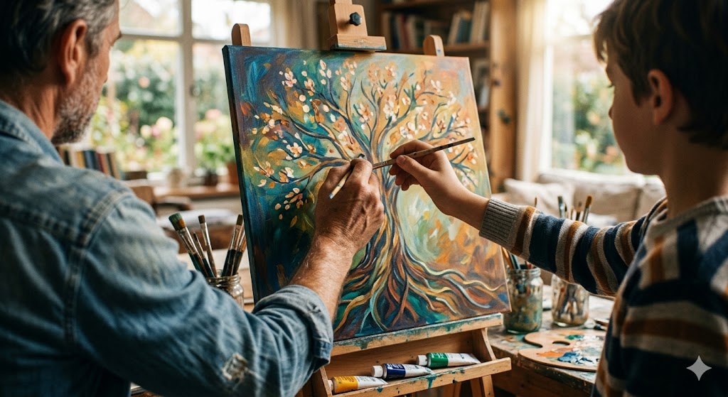 사진 속 두 사람의 손이 캔버스 위에서 조화롭게 움직이는 것처럼, 여러분과 자녀분들이 서로의 진심을 확인하고, 화해의 붓질을 시작하신 모습이 그려져 마음이 참 훈훈해져요.